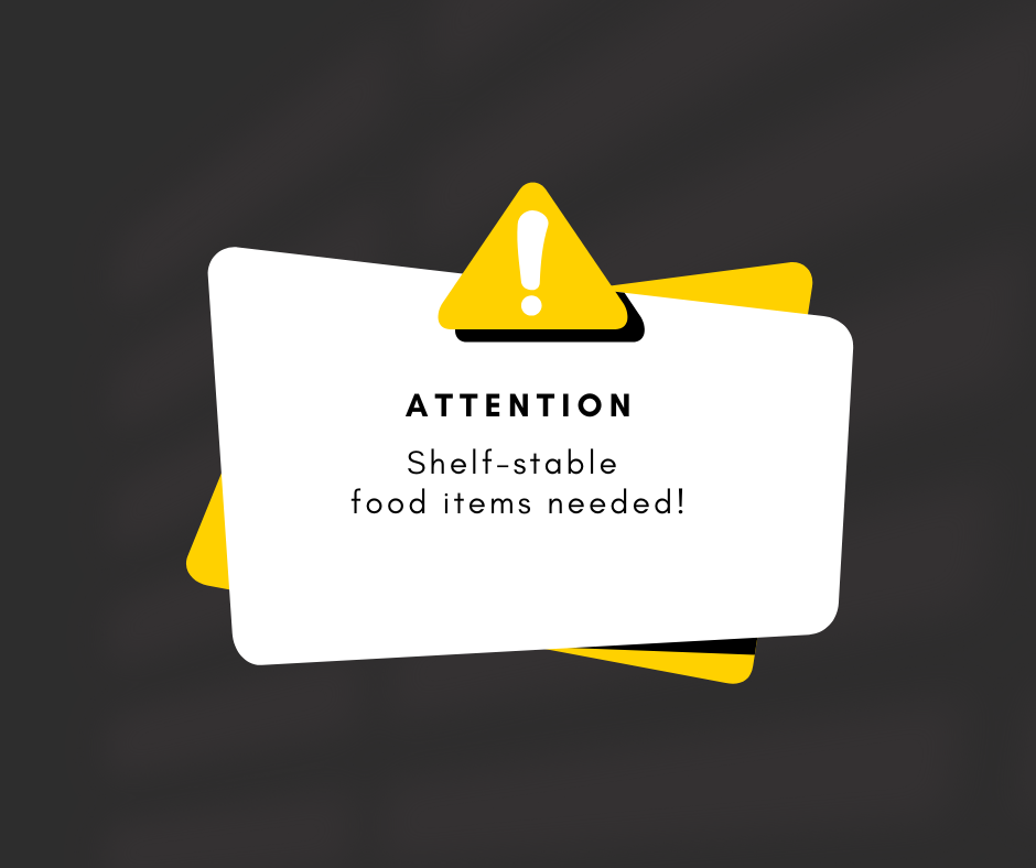 ANY shelf stable food is helpful right now. We are currently out of peanut butter, jelly, canned chicken, shelf-stable milk, chili, spaghetti, and rice.